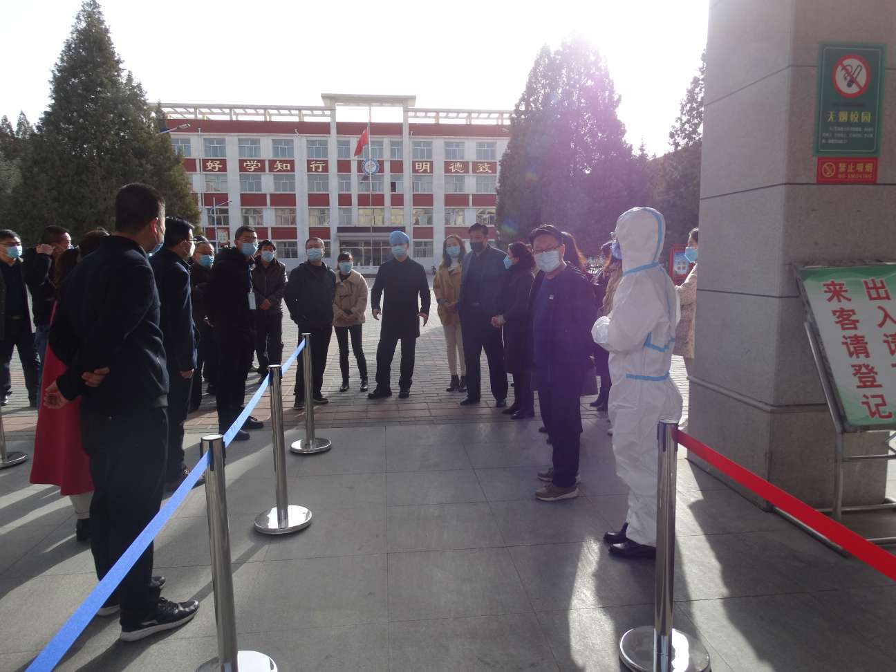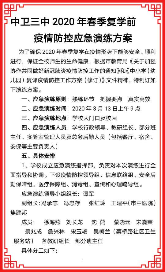 为了确保2020年春季复学在疫情形势下能够安全、顺利进行,保证全校师生的生命健康,根据市教育局《关于加强协作共同做好新冠肺炎疫情防控工作的通知》和《中小学(幼儿园)复课疫情防控工作方案(修订)》文件精神,3月13日上午,中卫三中进行了春季复学疫情防控演练,学校疫情防控领导小组,对本次演练工作做了周密的安排和部署。